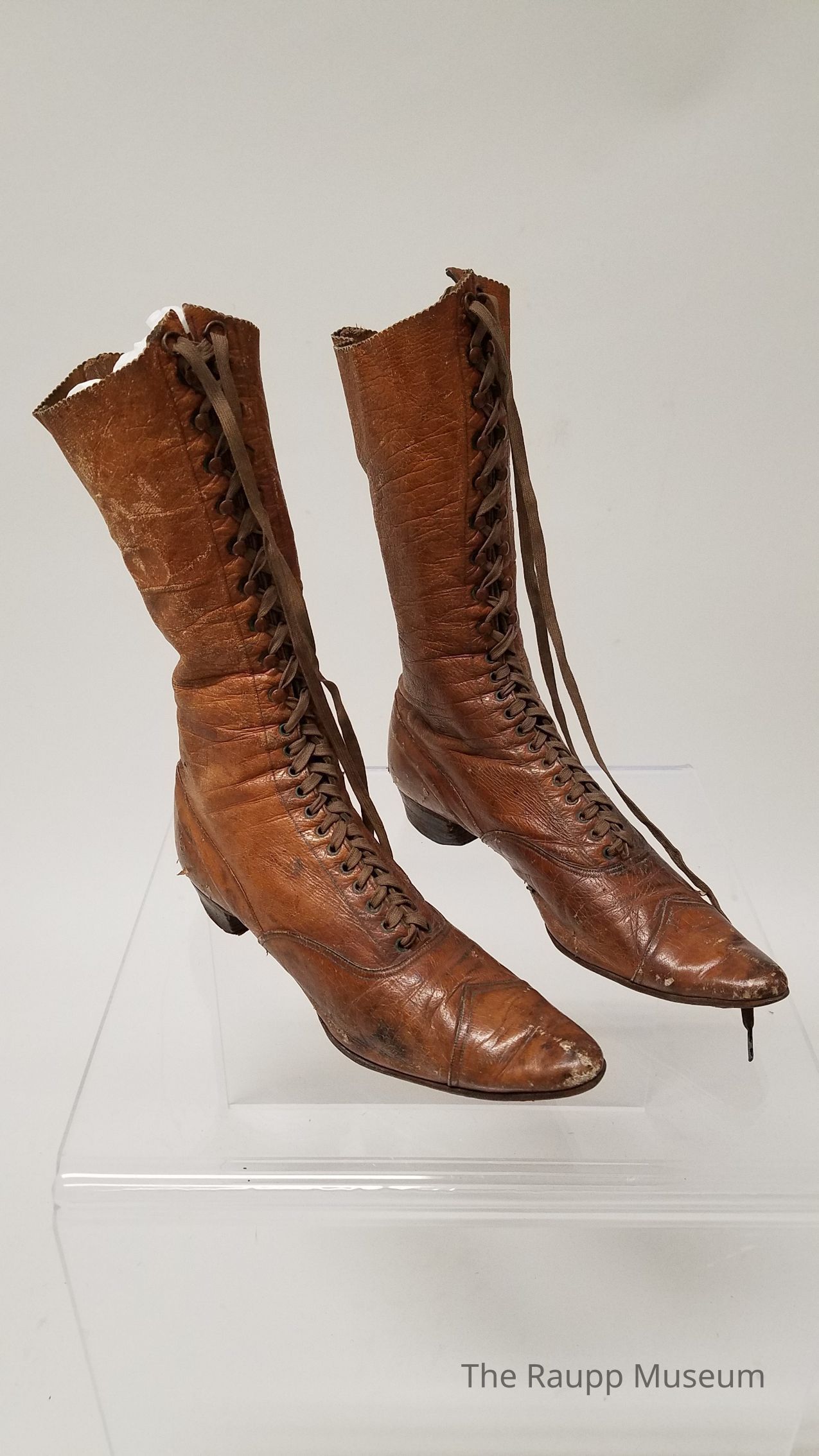 Pair of light brown leather lace up ankle boots. Leather is very soft and thin. With one-inch stacked heels and tan laces. Adhesive label on inside of boots “(size) 36; 7285.”Dimensions