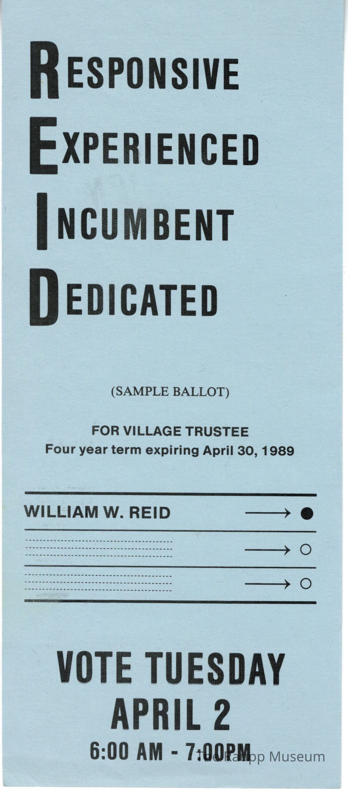 One (1) blue rectangular election pamphlet for Bill reid, with sample ballot.