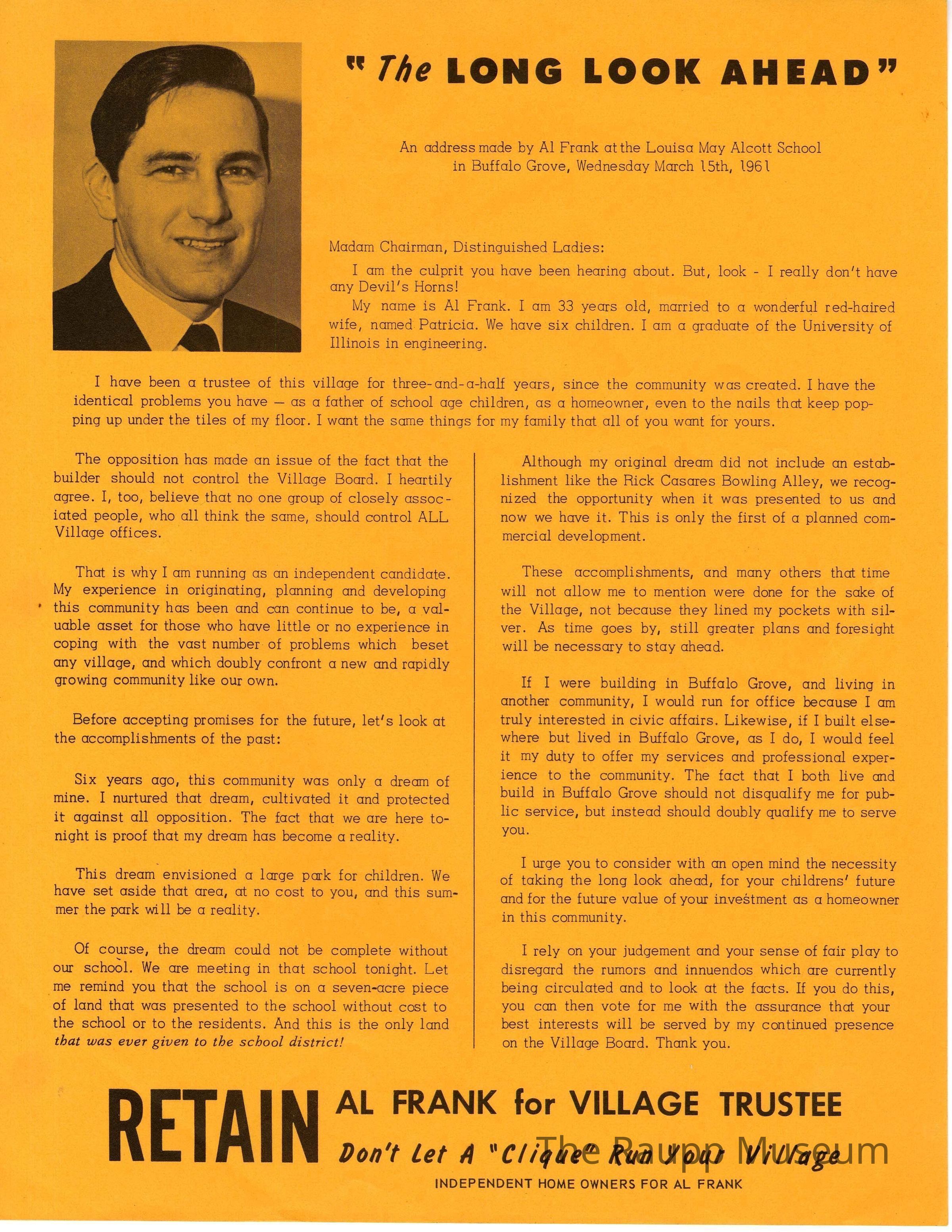 One (1) letter size orange paper pamphlet for Al Frank. Contains a picture of Al in the top left corner, and two columns of text about why you should vote for him in as Village Trustee in 1961.Archive Items Details