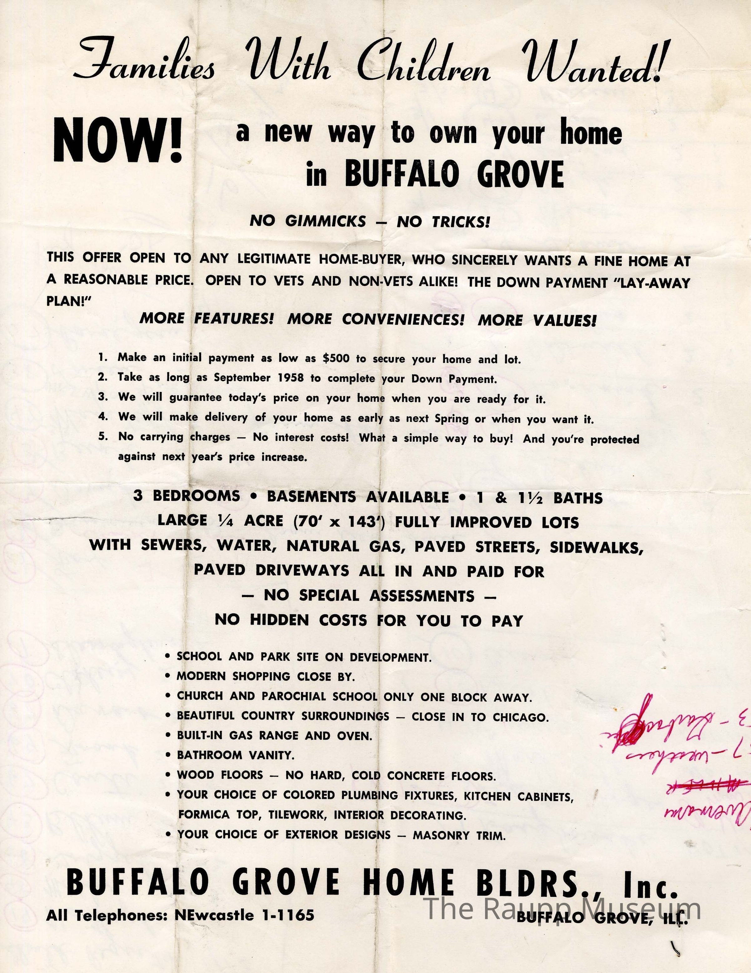 One (1) white with printed black text pamphlet for BG Home Builders, Inc. Pamphlet advertises an offer for buying a home from them in Buffalo Grove, and is geared towards families with children. Features multiple details about buying the house.Archive Items Details