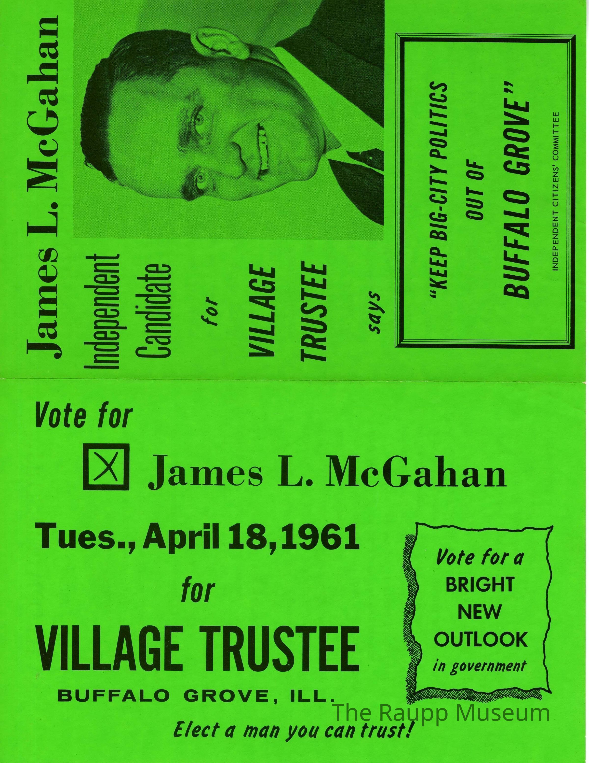 One (1) green and white folded pamphlet for James L. McGahan, running for village trustee in Buffalo Grove in 1961. Cover is green with a b/w picture of James and his tagline "Keep Big-City Politics out of Buffalo Grove". The inside has two pages about the candidate and his views, and the back is green with printed text about when to vote.Archive Items Details