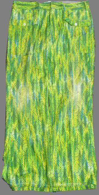 Trousers with zipper and hook closure and bold green leaf pattern. With repaired backside and holes at the knee. Front pockets have decorative pearly buttons. No manufacturer tags- possibly homemade.