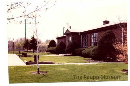 Color print with image of the brick exterior of a Buffalo Grove Park District building at Emmerich Park near the right hand side of the photo. With a pink tree on far right and bare birch sapling on the left of the photo. The park was dedicated in 1962.Made/Created
