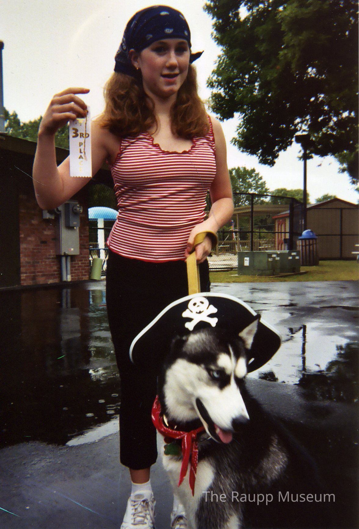 Color photographic print. Image of a young woman holding a white third place ribbon with a leashed huskie dog. The woman is wearing a black bandanna and a red striped shirt. Dog wearing a black pirate hat and red bandanna. Event is the dog costume contest with Willow Stream Pool in the background. Image printed on DuraLife paper. reverse side marks: "Kodak perfect touch processing Oct/4/03 ID948919 <21A> EGK1Made/Created