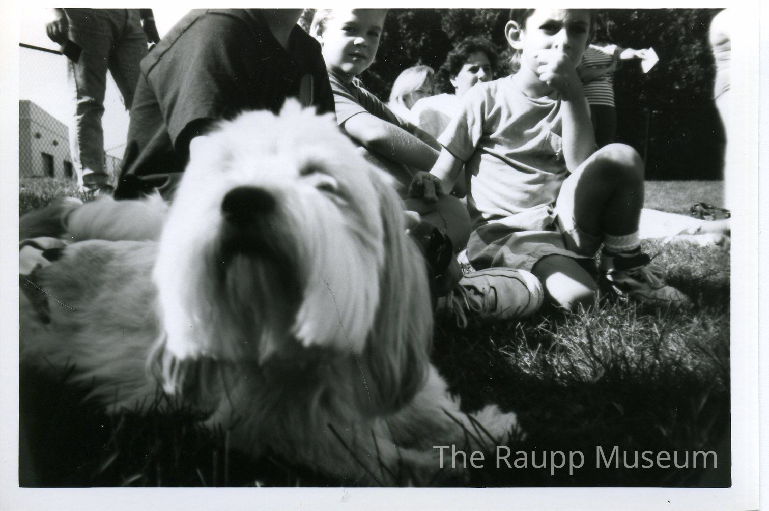 Black and white photographic print with a white border. Image of an outdoor Park District dog contest. Close-up of a dog's face and a boy wearing a t-shirt sittling in the grass with his hand by his mouth. Six other partially visable people in the photo. Image printed on Kodak paper. reverse side mark: "A3"Made/Created