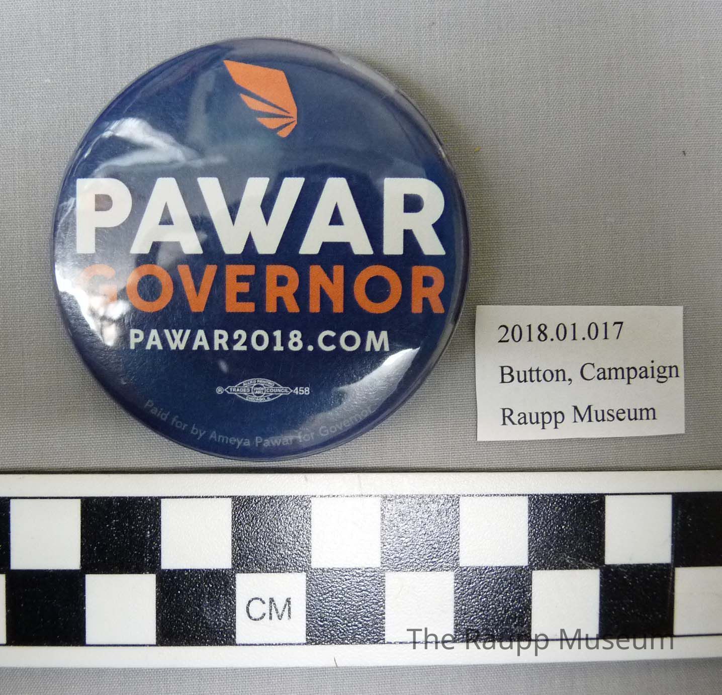One (1) political button. The button has the text "Pawar Governor pawar2018.com" on one side, and silver metal on the back side. There is a picture of an orange wing on the front. The button is white, orange, blue. There is a safety pin affixed to the back.Condition
