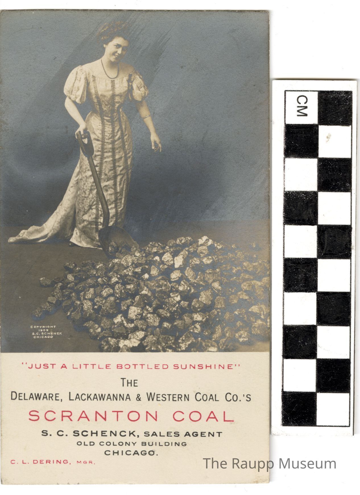 One (1) beige postcard with a black and white photo on the from of a women holding a shovel in her right hand and a pile of coal in front of her. She is wearing a light colored dress with three vertical stripes. On the bottom left corner of the photo is: "copyright 1909 S.C. Schenck Chicago". Below the photo is printed in red and black ink: " "Just a Little Bottled Sunshine"; The Delaware, Lackawanna & Western Coal Co.'s; Scranton Coal; S.C. Schenck Sales Agent; Old Colony Building Chicago; C.L. Dering, MGR."