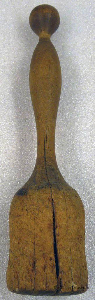 Solid wood pestle. Knob at the top of a curvy flared handle on a bell shaped head. Large vertical open crack running length of head.