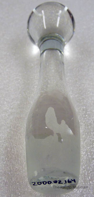 Clear glass pestle with bulbous handle, tapered body and frosted more bulbous end for grinding. Generally shaped like a bowling pin. Frosted area extends halfway up the body.