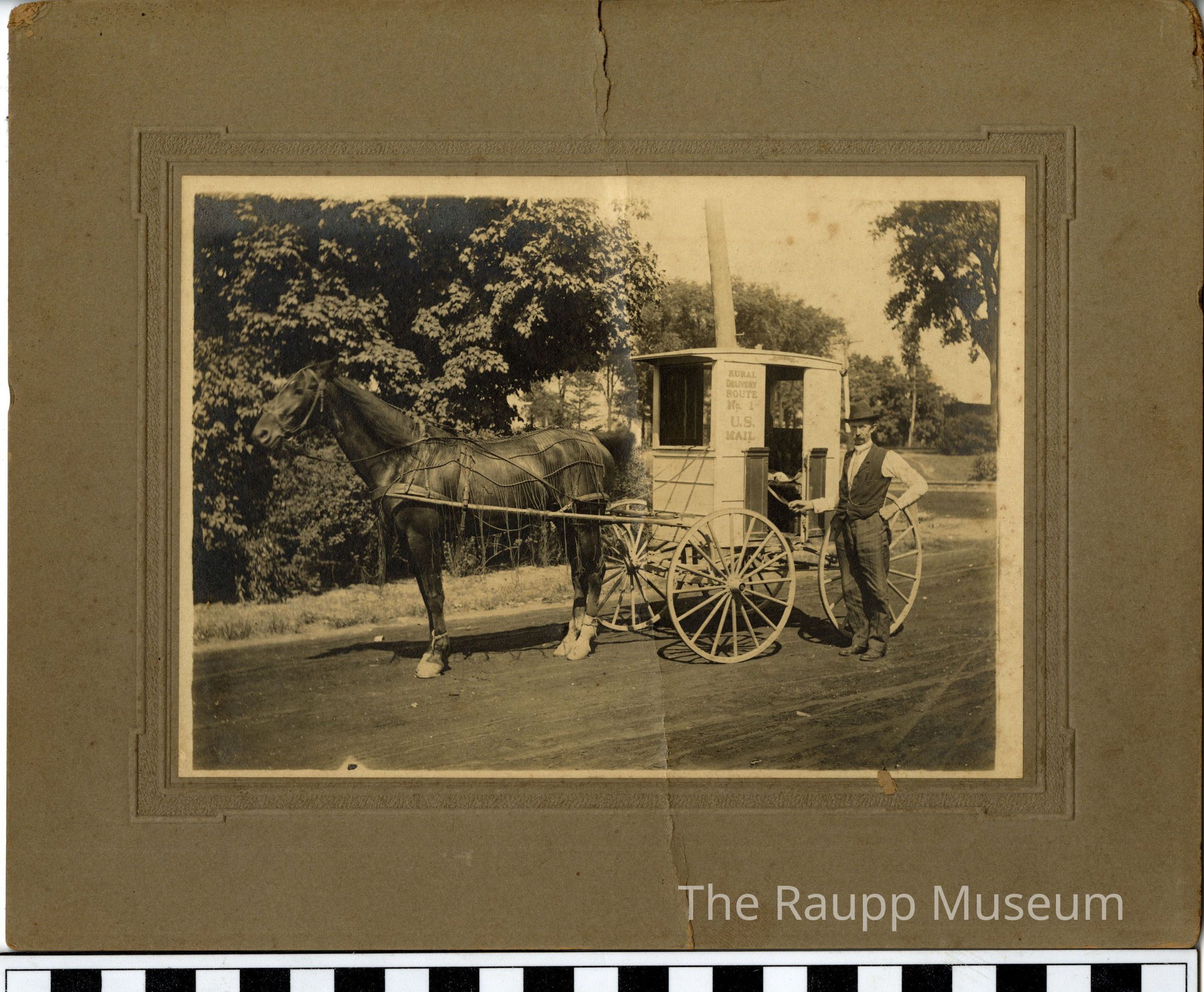 One (1) black and white sepia toned photograph of Peter Weidner standing next to a US Mail carriage, being pulled by a brown horse. Peter is standing on the right, his right hand holding the horse reins through the carriage. He is dressed in black pants, a black vest, and white undershirt with a black bowl hat. Next to him is a one person white carriage with four wheels. On the side is printed "Rural Delivery Route No. 1 U.S. Mail". In the background are trees and an open field. They are situated on a dirt road.