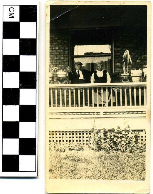 Black and white photographic print with white border. Image of a man wearing a suit and hat sitting on a porch swing with a woman wearing a ruffled white shirt, vest and long skirt. They are seated in front of a large window and behind a white railing. Lattice fencing around the ground. reverse ink inscription text: "Philipp Raupp and wife Kansas City."Dimensions