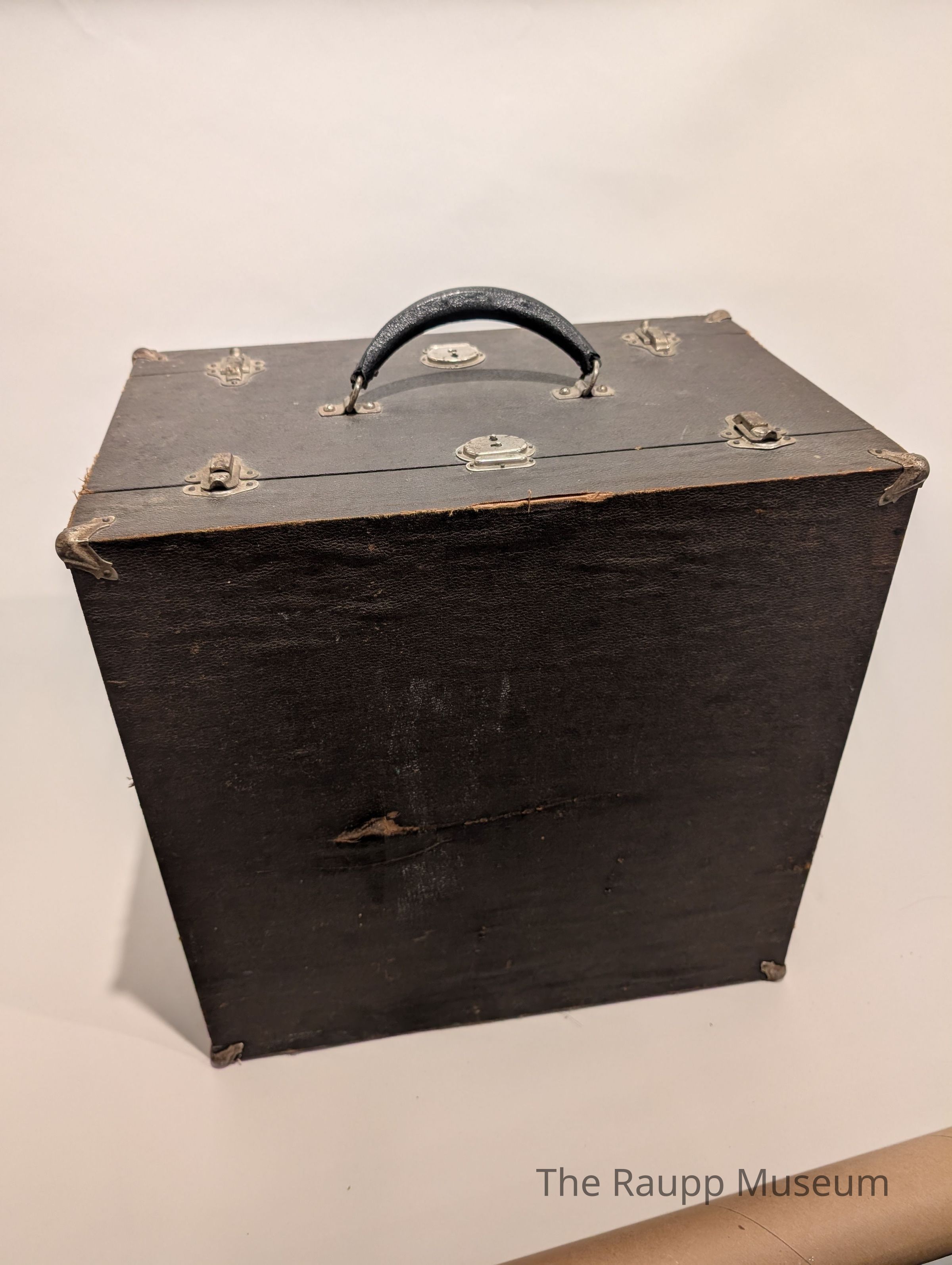 Wooden Phonograph box with record cylinders located within it. The box is wooden but has a leather looking cloth on all sides. Every corner has a metal stopper to protect the corners. The top of the box has a handle covered in sturdy black material. There are also four clasps and two "locks" to open the box from both sides and store cylinders within. Inside, the cylinders are all in their own indented spot to keep them protected. There is also red cloth to help with protection as well. These cylinders have different numbers and some even have full packaging that say "Edison Record."Relationships