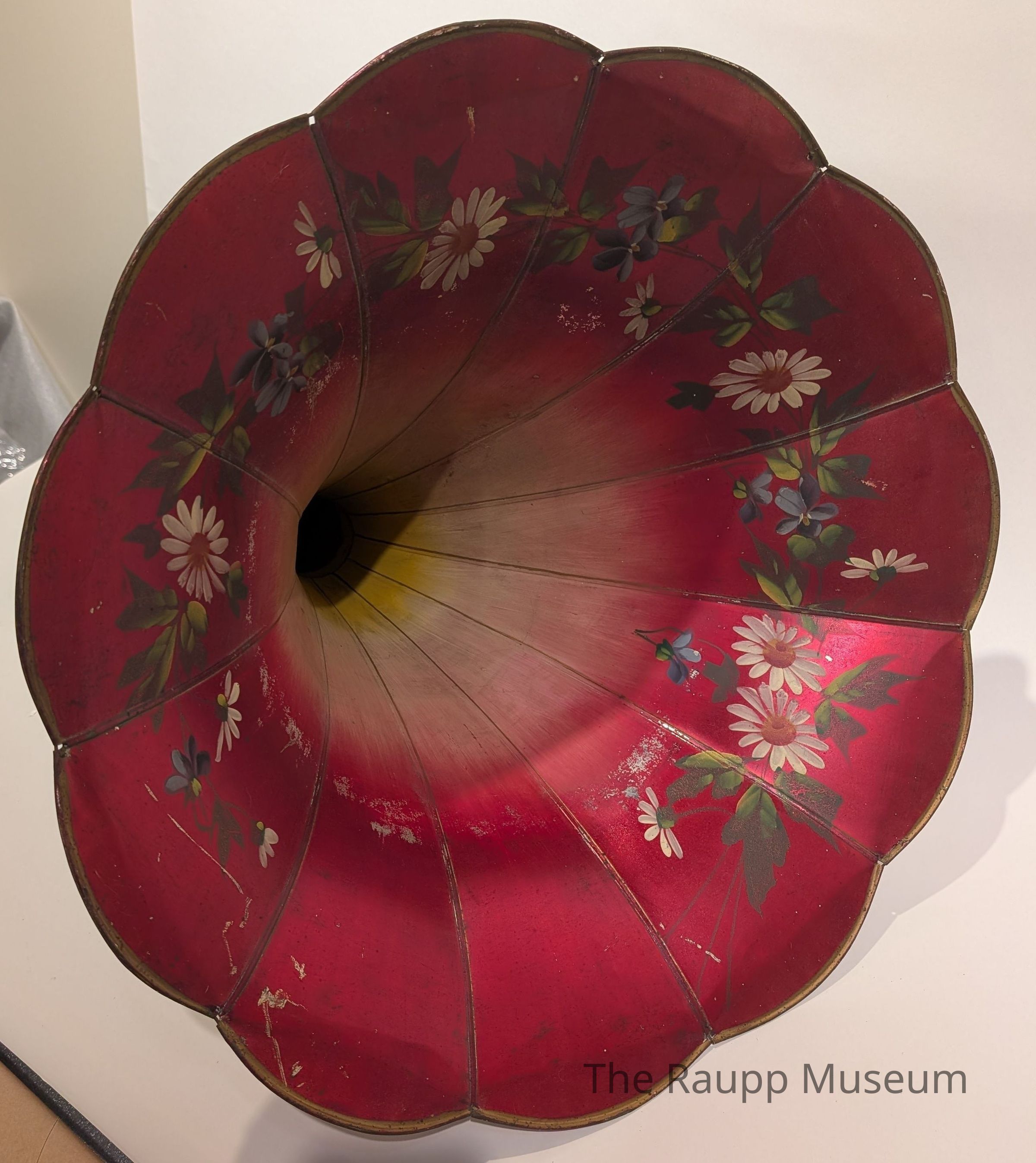 A large metal phonograph horn painted red on both the outside and inside, but the inside has added designs. These designs consist of white and blue painted flowers with green leaves surrounding them. The red also changes into white and eventually yellow through gradient changes. Each section of the phonograph horn has ridges which form the flower like shape of the horn and edges are all curved.Relationships