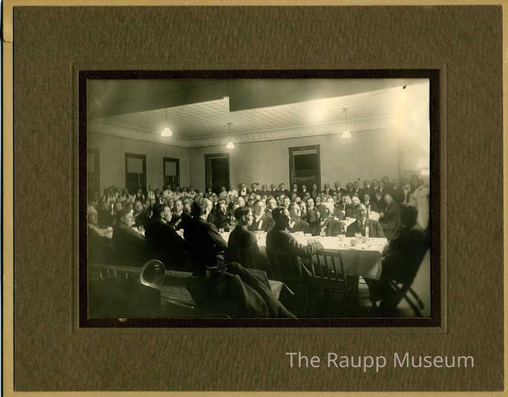 Black and white print mounted in a two-tone brown mat. Image of rows of men wearing suits seated around the perimeter of the room and around long tables. Room has hanging pendant lighting and a tin ceiling. With a trombone, case, and over coat on a table in the lower left corner of the photo.