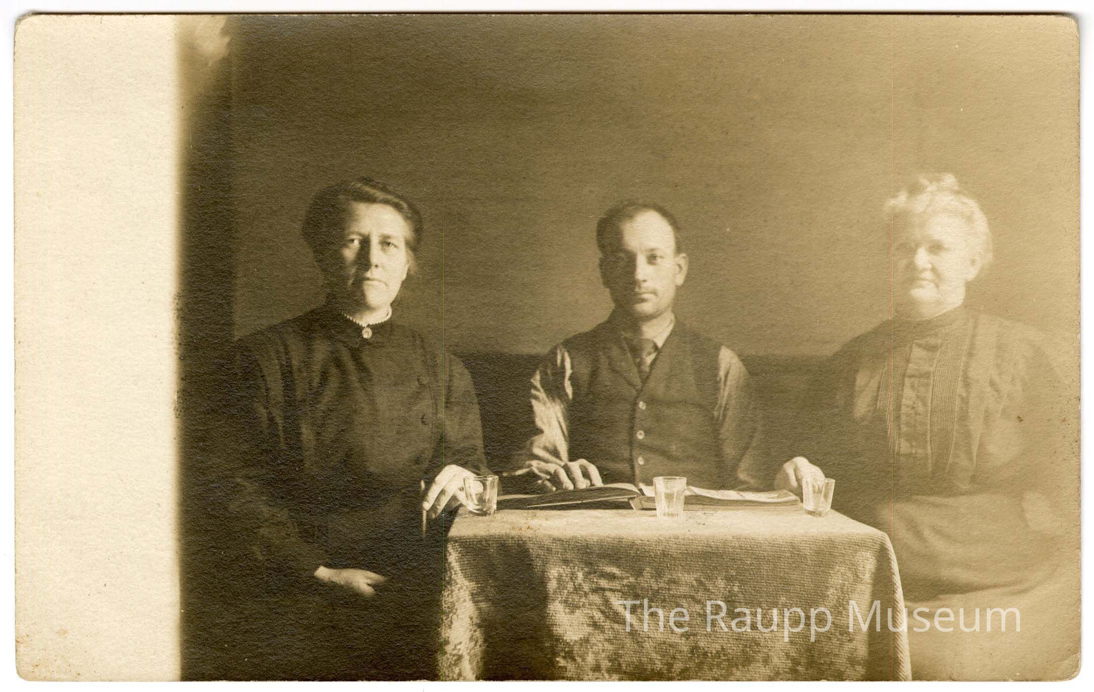 One (1) sepia-toned postcard photograph depicts three individuals sitting around a table, which is covered with a textured cloth. On the left, a woman in a dark dress with a high collar. Seated in the middle is a man wearing a vest and tie. On the right, an older woman dressed similarly in dark attire. The table in front of them holds small cups and an open book or possibly a photo album.