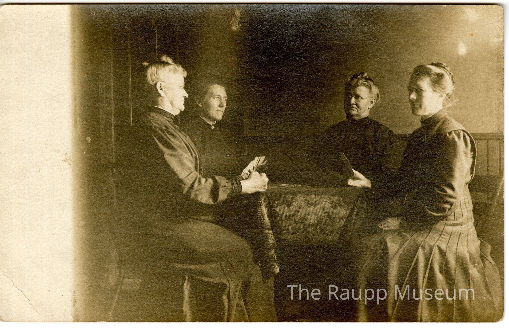 One (1) black and white/sepia toned photo postcard of four women playing cards at a small table. Women are wearing black dresses and seated on wooden chairs, with a decorative cloth over the table. The two women in the foreground are holding cards in their hands. Their hairs are done up in bun and braid style hairstyles. There is decorative wooden paneling up half the wall in the back. Mary Leikam (br Gloden) is the second woman from the right.