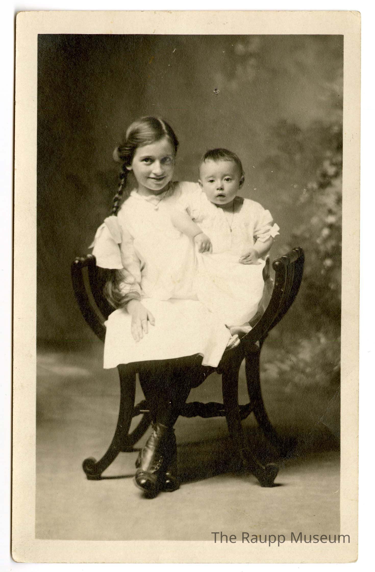 One (1) photographic postcard, sepia-toned image of a young girl and a baby seated together on an ornate chair against a softly focused backdrop. The girl, with a long braid draped over her shoulder, is dressed in a light-colored dress with puffed sleeves. She holds the baby, who is also in a light-colored garment. The wooden chair has curved legs and an intricate design. The background is blurred with a floral motif.