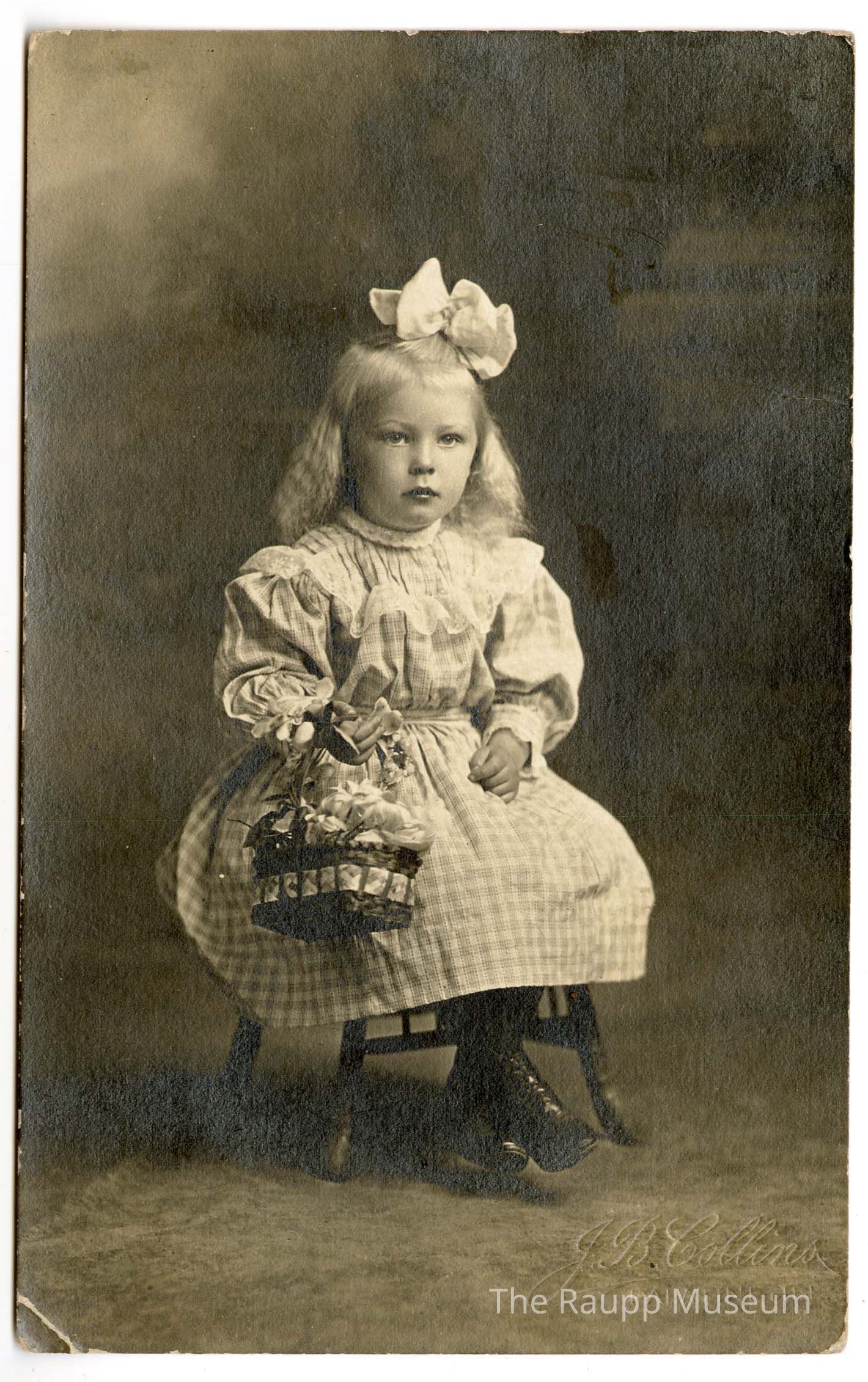 One (1) photographic postcard, sepia-toned image depicts a young girl seated on a small wooden chair. The girl is dressed in a checkered, long-sleeved dress adorned with a lace collar, her hands clasping a basket filled with flowers. Her hair, likely blonde or light-colored, is partly down and up with a white bow on the top of her head. She gazes directly at the camera. Her feet are clad in dark, lace-up boots. This photograph is embossed with "J. B. Collins from Palatine, ILL". The photo background is a dark, blurred with rug.