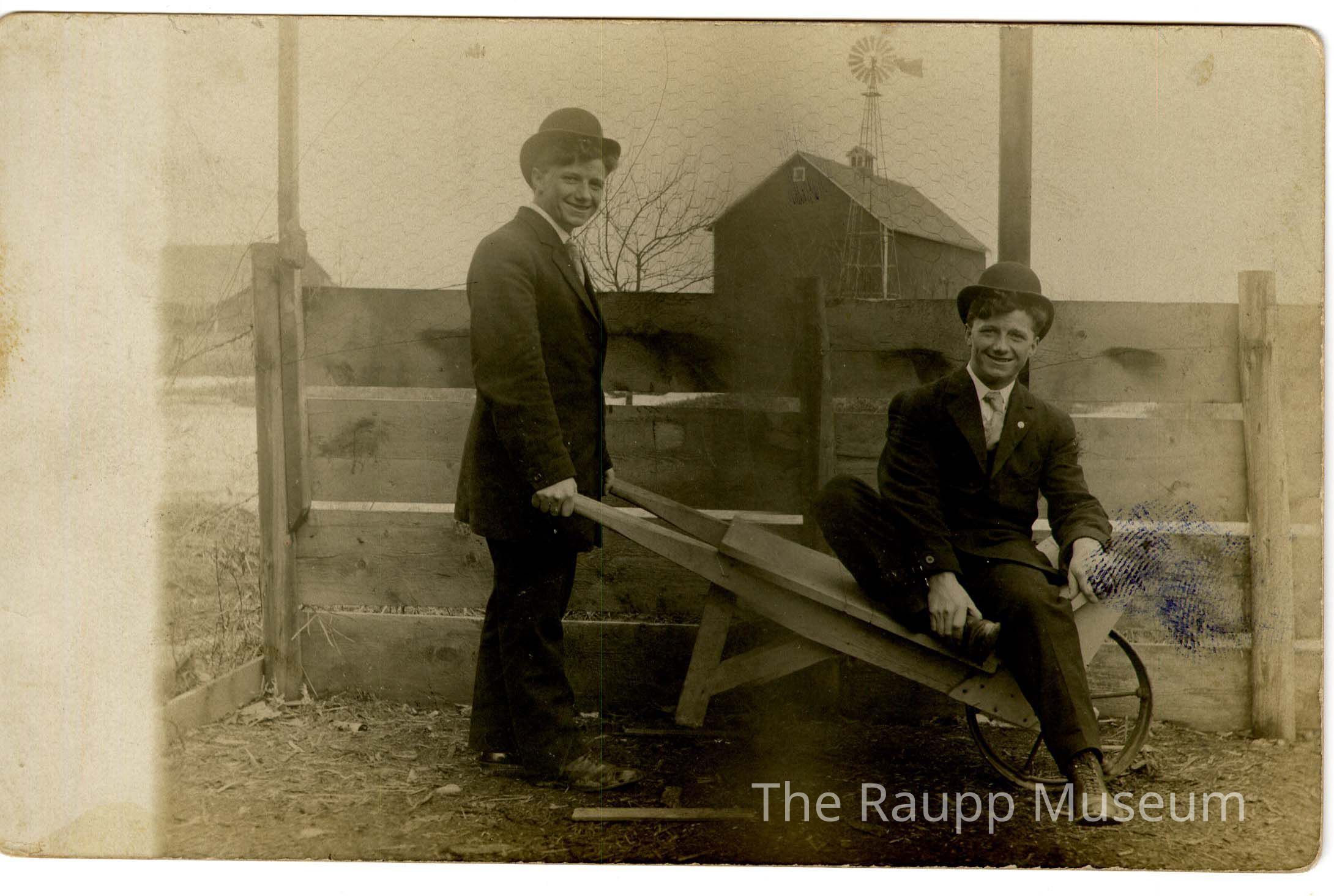 One (1) photographic postcard, sepia toned image of two men wearing formal suits and bowler hats. One man is standing and holding the handles of the wheelbarrow. The other man is seated comfortably inside the wheelbarrow. Both men look identical. The background reveals a wooden fence and a barn, along with a windmill.
