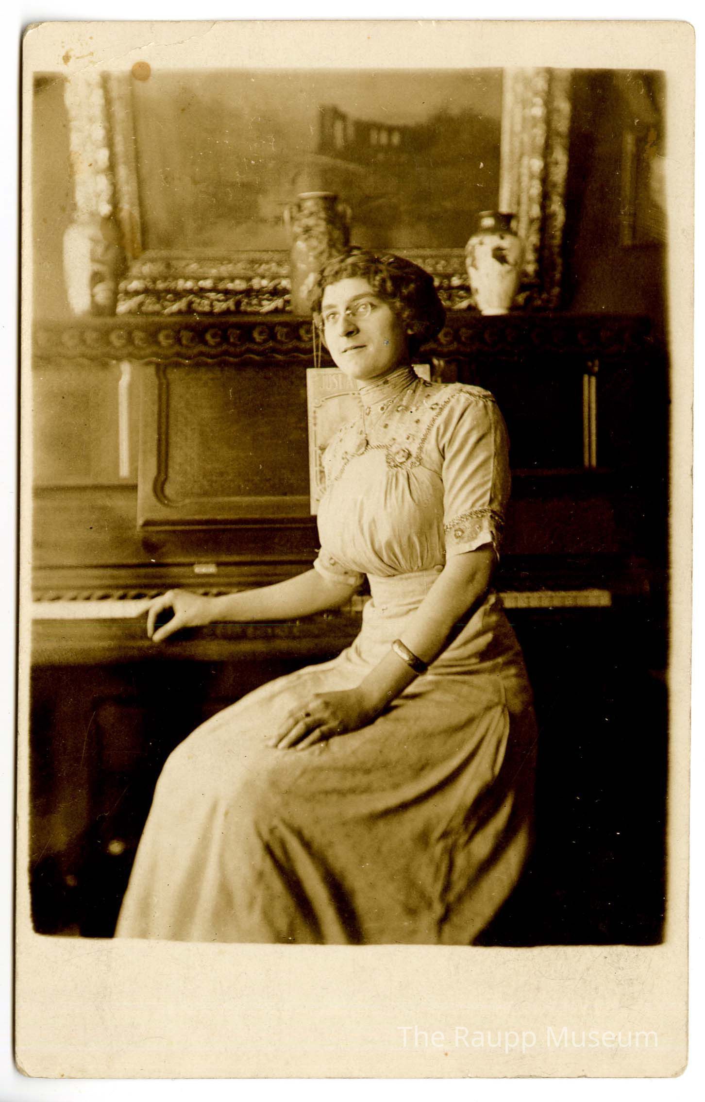 One (1) photographic postcard, sepia-toned, depicts a woman seated at a piano, wearing a long-sleeved dress with intricate embroidery around the collar and sleeves. Her hair is styled neatly, and she gazes to the side. Her right hand rests gently on the piano keys, while her left hand is placed on her lap. Behind her, a richly decorated piano stands against the wall, adorned with ornate vases and a picture/painting.