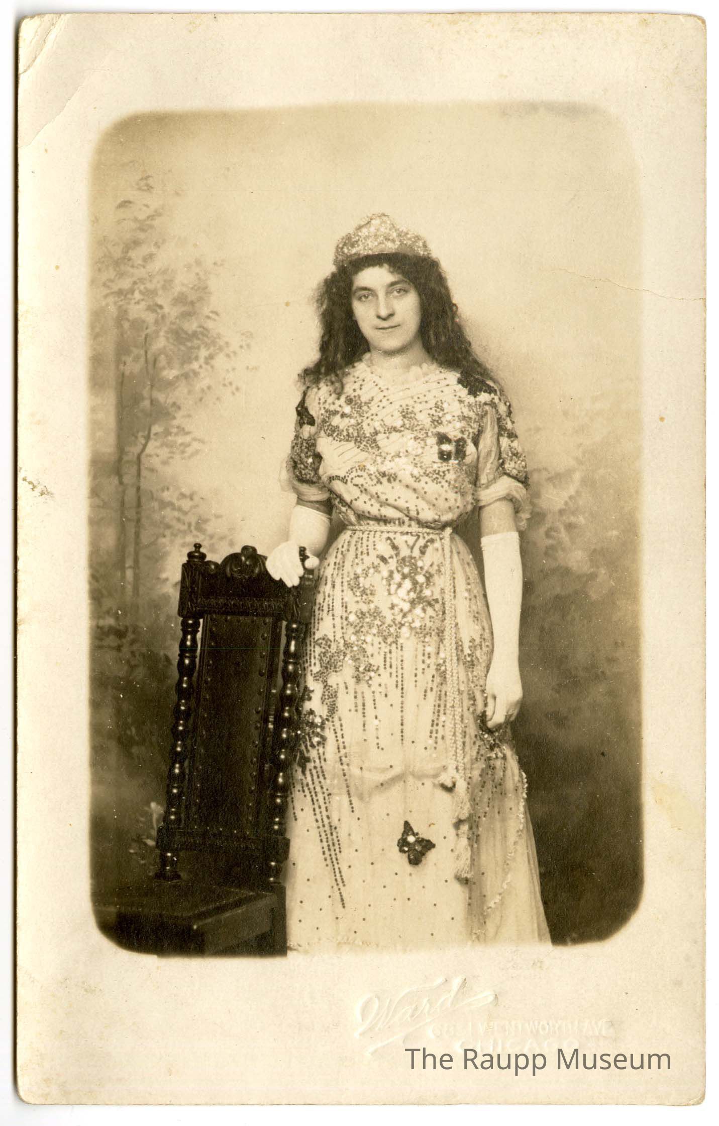 One (1) photographic postcard, sepia-toned of a woman standing beside an ornately carved wooden chair. The individual is dressed in an intricately detailed gown adorned with embellishments/sequins and floral patterns, and a butterfly design piece attached near bottom. There is a tiara on their head, with long curly hair down. The setting features a faint backdrop resembling a faded mural or tapestry. Their have their right hand resting on the chair, and the other gloved hand hanging by their side. On the bottom is an embossed photographers mark: "Ward, 60 Wentworth Ave, Chicago".