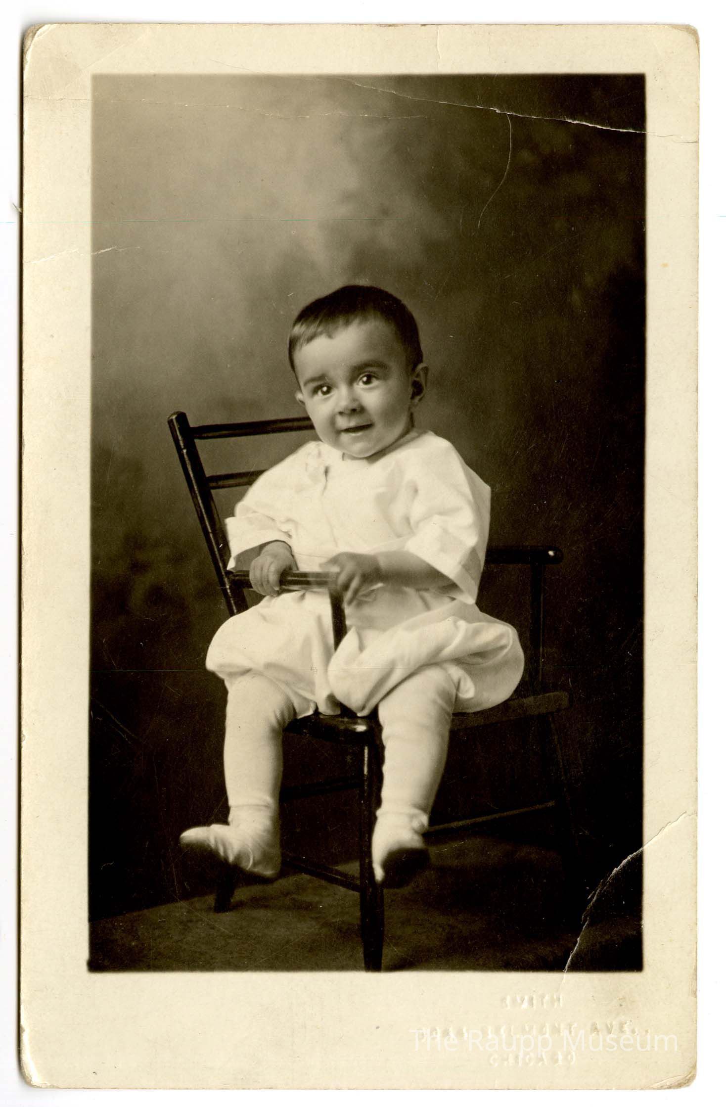 One (1) photographic postcard, sepia-toned has a small child sitting on a simple wooden chair. The child is wearing a flowing white outfit and tights. The chair is basic, with a straight back and slightly slanted legs against a dark, textured background. The photographer's imprint, located at the bottom, hints at a professional studio setting on Belmont Avenue in Chicago.