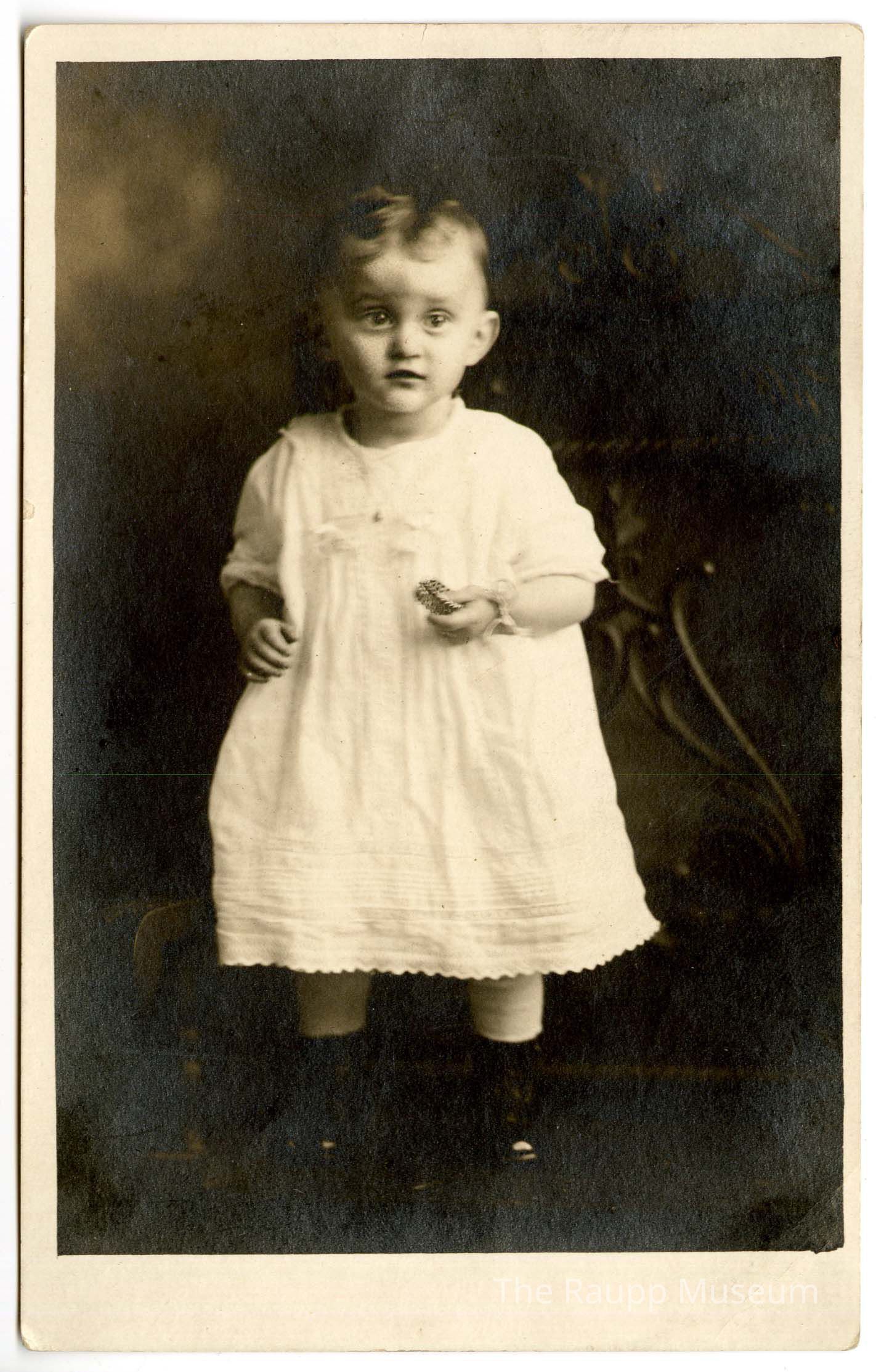 One (1) photographic postcard, sepia-toned image of a young child standing, dressed in a simple, white gown that reaches below the knees. The child has short hair, and appears to be holding a small object or toy in one hand. The background is dark and blurred. The child has on black boots and a pendant necklace. There is a piece of decorative furniture in the background.