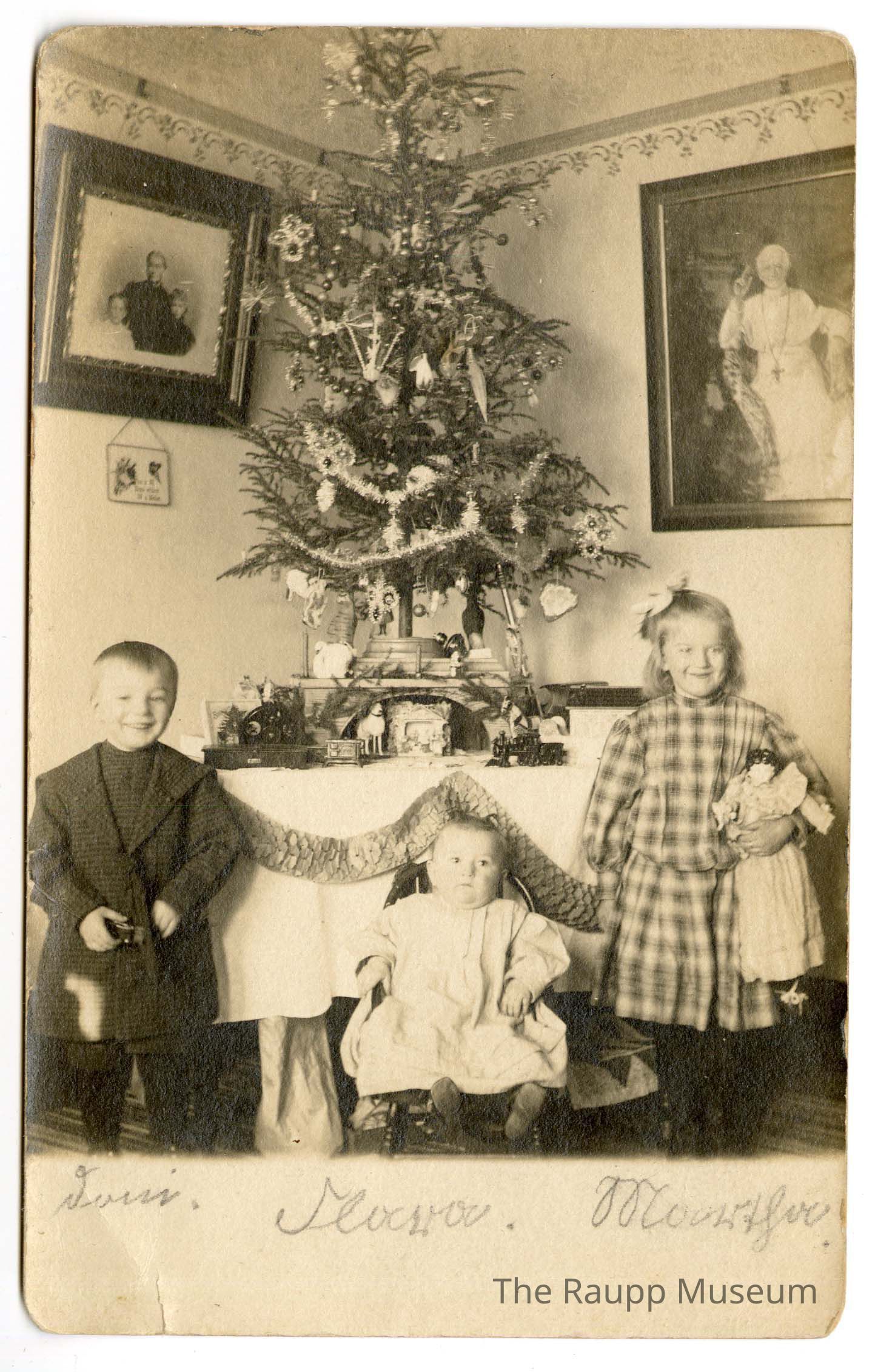 One (1) photographic postcard, sepia-toned has three children positioned in front of a decorated Christmas tree, which is adorned with ornaments and garlands. The young boy on the left is dressed in a coat, smiling with a toy in his hand, while the boy seated in the middle on a small chair appears to be in a gown. On the right, a girl wears a plaid dress and holds a doll in her left hand. The tree stands upon a table, with figures and other festive items and toys below it. The room is accented with framed portraits on the walls, and image of a Catholic male figure on the right and a family portrait of a woman and 2 children on the left. Handwritten under each child are names, but they are not legible.