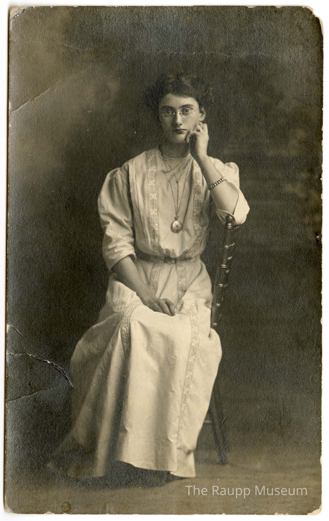 One (1) photographic postcard, black and white of a woman seated on a decorative wooden chair. She wears a long, flowing dress with delicate embroidery along the edges. Her left hand is resting on her cheek, while her right hand is placed on her lap. A pair of round spectacles on her face, and around her neck hangs a prominent pendant on a chain, The backdrop is a textured, faded background.