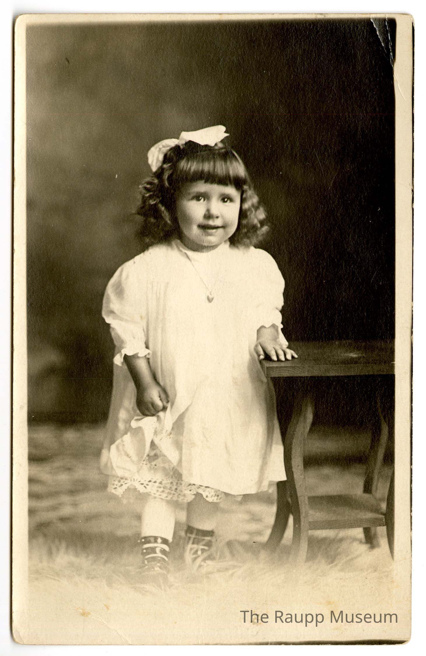 One (1) photographic postcard, sepia-toned of a a young girl standing beside a wooden table. She is wearing a white dress adorned with lace at the hem, and dark, intricately patterned shoes. She has on a heart pendant necklace and a white bow on top of her head. The backdrop suggests a studio setting, with a textured, carpet floor and soft-focus background. Her left hand is resting on the table, and her right hand is holding onto her dress.