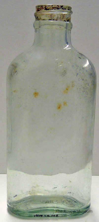 Green rectangular shaped glass bottle with rounded corners and tapered screw top groove neck without a lid. Embossed base: "2416" and "P" logo inside of a circle. With vertical seams on the sides. Commonly used for bottling medicines.Made/Created