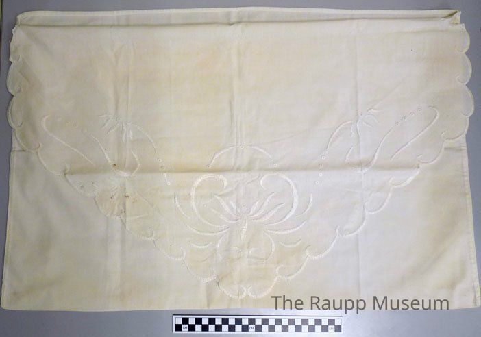 White linen pillowcase. With a folded triangular envelope type panel with white embroidered eyelet design and scalloped edge.