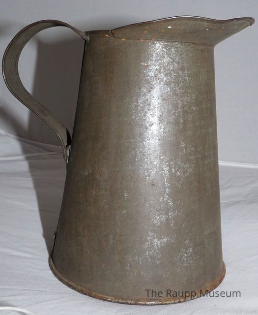 Gray cylindrical tin pitcher wiith handle and a wide, short spout. Lightly rusted and discolored.