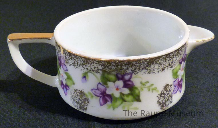 Small, round, white porcelain cream container, no lid. Painted purple and white floral pattern with gold accents. Creamer has an angular handle with flat topped, gold painted handle and angular white spout.