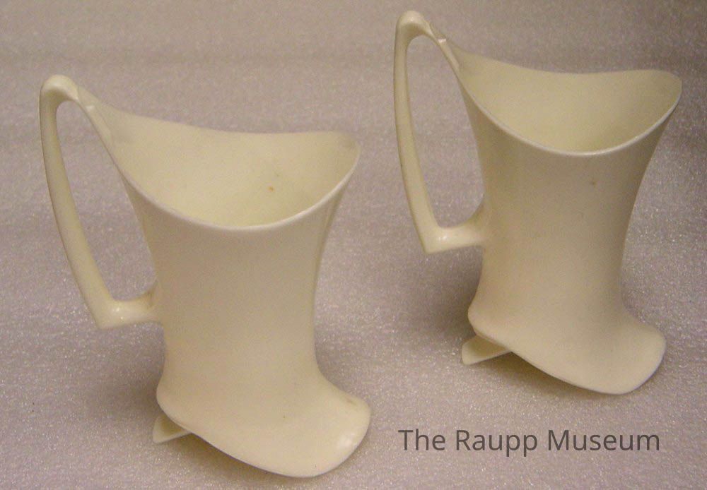 One (1) white plastic syrup pitcher spouts (dispensers), with a curved shape and handle on one side. Bottom of pitcher has a lever that allows syrup to flow out of it. A round cap in the bottom of the pitcher limits the amount of syrup that flows out. There is an embossed log cabin on bottom of syrup spout. There is a "1C" in purple ink stamped on the top lid.Dimensions
