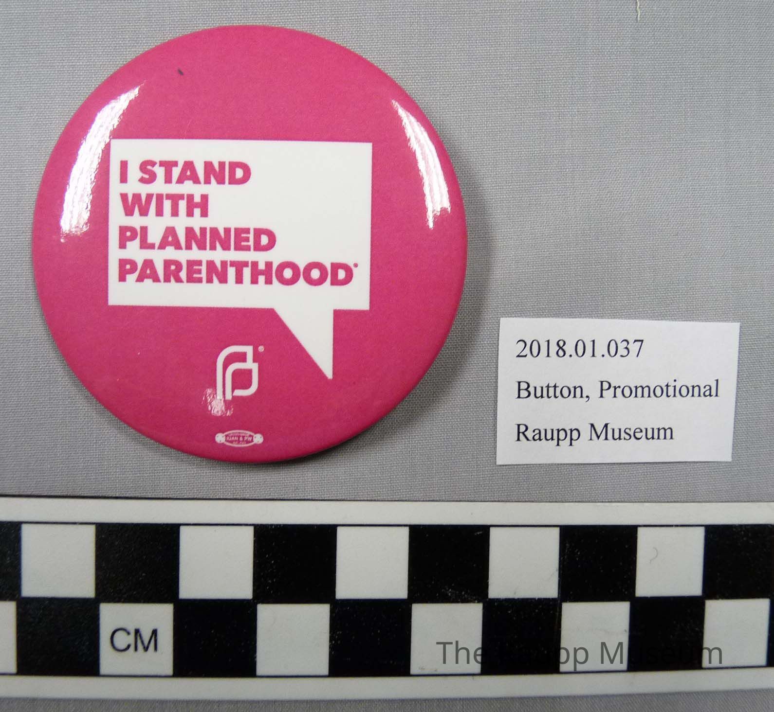 One (1) promotional button. The button has the text "I stand with Planned Parenthood" and the Planned Parenthood logo on one side, and silver metal on the back side. The button is whiteand pink. There is a safety pin affixed to the back.Condition