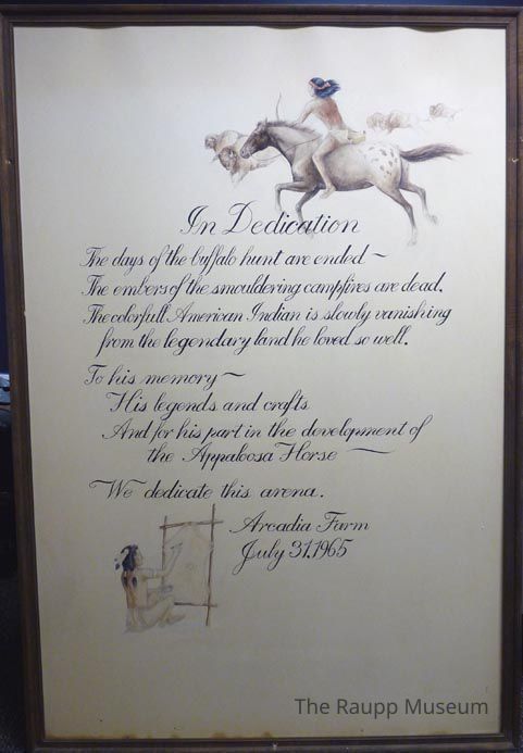 Original watercolor painting and calligraphy on heavy paper. Image of a Native American on an appaloosa horse chasing a buffalo near the top and a second figure seated and painting on an animal skin near the base. Black handwritten text in calligraphic script in the center. Acts as dedication for Arcadia Farms Arena, July 31, 1965. Stored in a brown wood frame without glass. Presented as the dedication of new horse arena at Arcadia Farms owned by Blanche Kloman.Relationships