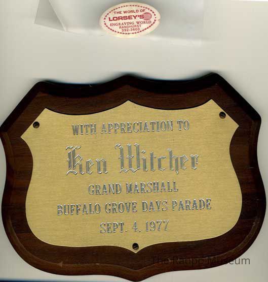 Wood plaque with scalloped edges and gold colored panel with metal engraving attached with three metal screws. "With appreciation to Ken Witcher Grand Marshall Buffalo Grove Days Parade Sept. 4, 1977." With groove on the back for hanging and residue from adhesive foam. Loose oval manufacturer tag "The World of Lorsey's Engraving World."Made/Created
