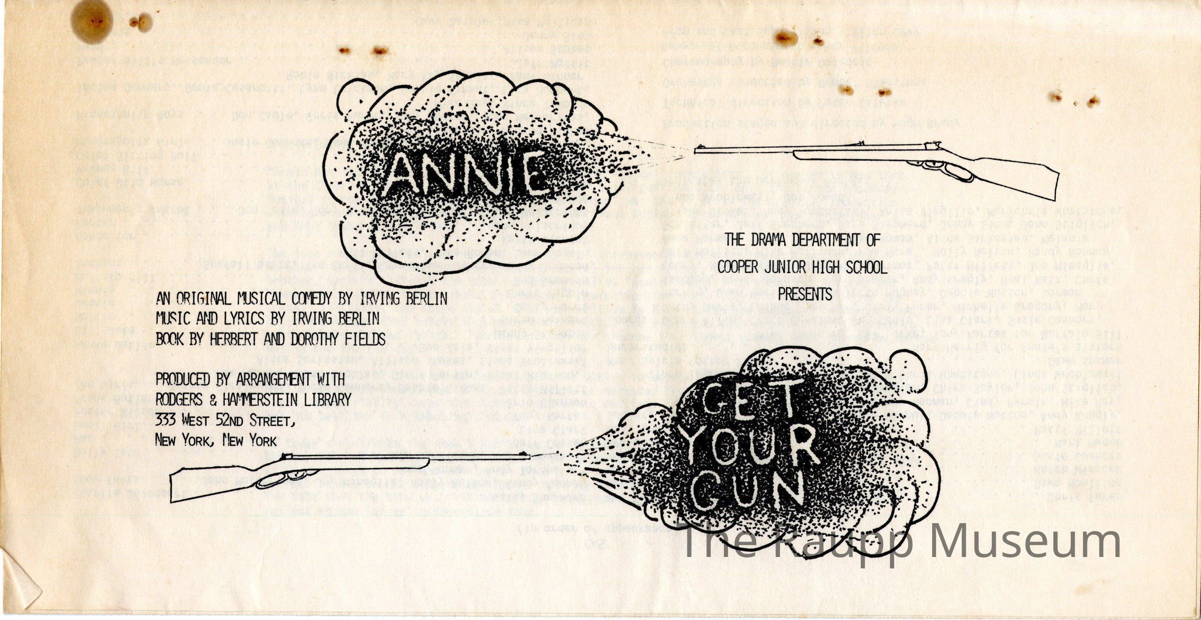 One (1) black and white printed program for "Annie Get Your Gun" at Cooper Junior High School. Program is a trifold, with a drawing of two guns on the front with smoke, and text. On the inside pages are cast, synopsis of scenes, and orchestra and production staff. On the back is a note about the play and information about the school administration.Archive Details