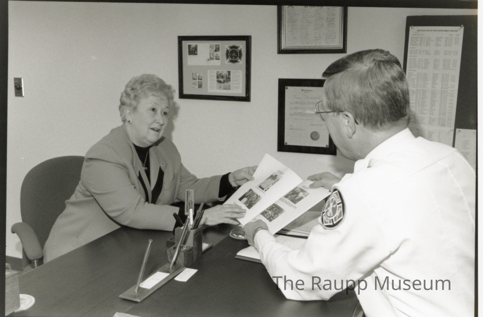 One (1) black and white photograph of Verna Clayton looking at photos on a paper with a police officer, seated at a desk. There are framed documents behind them.Made/Created