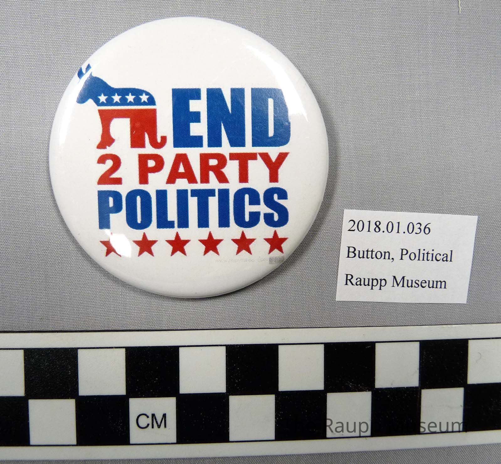 One (1) political button. The button has the text "End 2 party politics" on one side, and silver metal on the back side. There is a picture of a combination donkey and elephant animal on the front. The button is white, blue, red. There is a safety pin affixed to the back.Condition