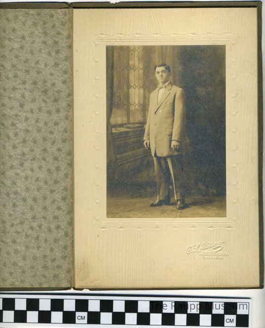 Black and white print mounted to a white mat board and presented in a brown textured folder. Folder is vertically bi-folded with a wood-grain texture. Interior has a discolored textured vellum insert glued to the image mat board. Portrait image of Julius J Hohmann wearing a baggy suit and bow tie. Studio backdrop has a window on the left. reverse side of mat board pencil text: "Julius J Hohmann at age 20."Dimensions