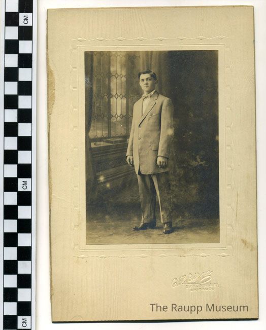 Black and white print mounted to a white wood-grain textured mat board. Left edge has remains of a white textured vellum insert glued to the mat. It may have been a folder insert at some point. Portrait image of Julius J Hohmann wearing a baggy suit and bow tie. Studio backdrop has a window on the left. reverse side of mat board pencil text: "Julius J Hohmann at age 20."Dimensions