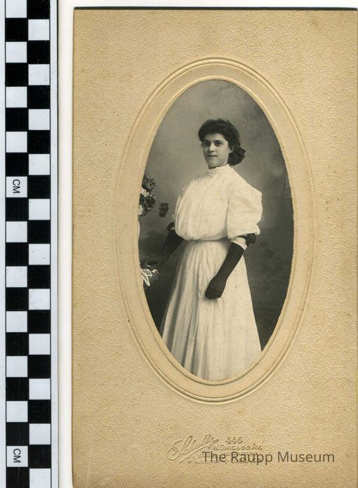 Oval black and white professional print mounted to a heavy tan card with embossed faux frame. Image of a young woman with a large bow at the back of her neck, wearing a loose fitting blouse with lace eyelets and a long skirt. She is wearing long black gloves and two bows at her elbows. She is standing next to a partial image of a vase of flowers with scalloped doily on a wicker table on the left side of the image. Backdrop is the same as 1996.08.076.Dimensions