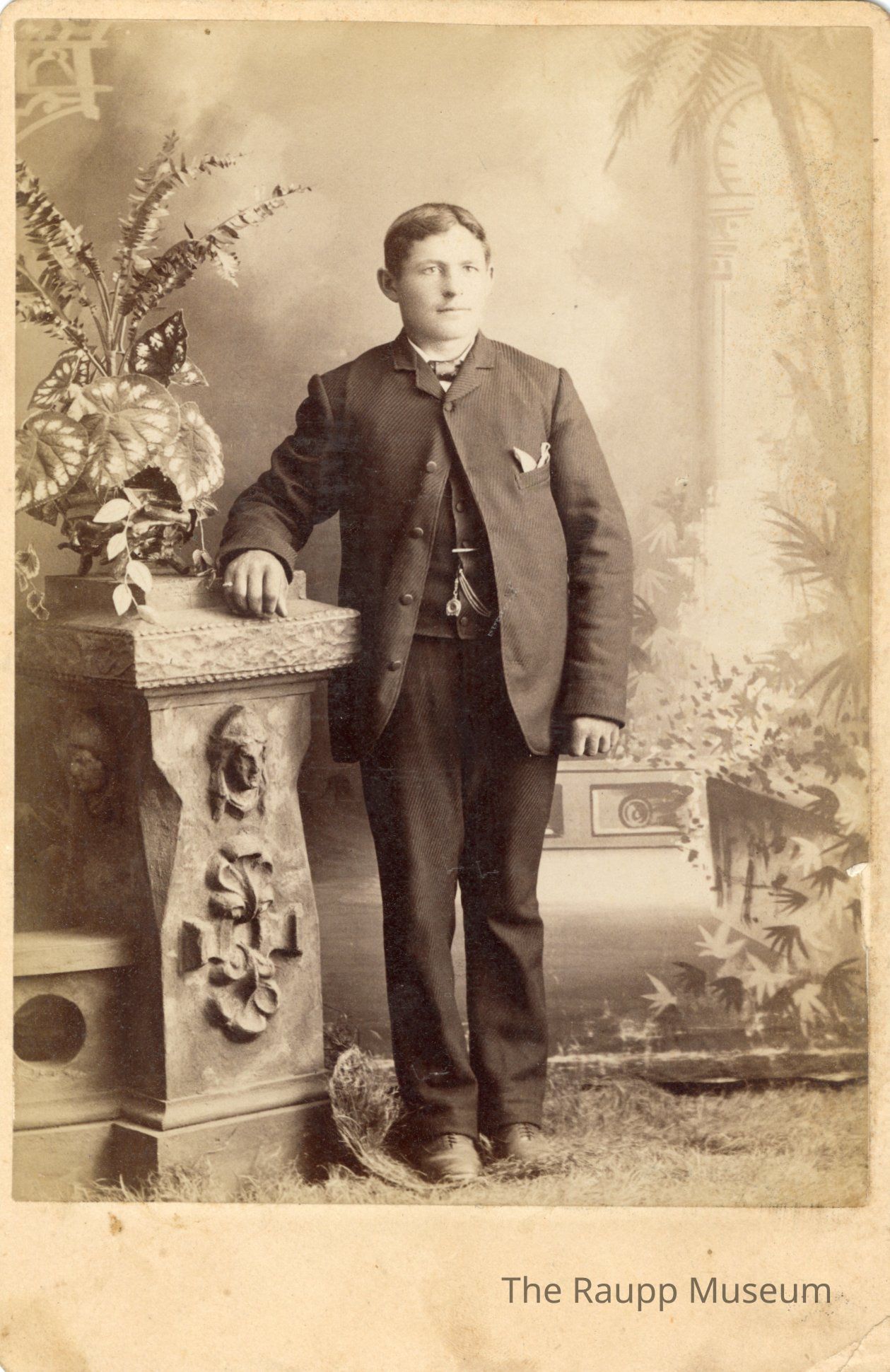 One (1) black and white sepia toned photograph of a young man. Man is wearing a three piece suit with dark coat, vest, and pants, and a white undershirt with dark tie. His right arm is resting on a decorative pillar with a bouquet of flowers on top. He is standing in grass, with a painted background of leaves, and buttresses behind him. He has a white handkerchief in his left pocket and a metal chain near his belly.