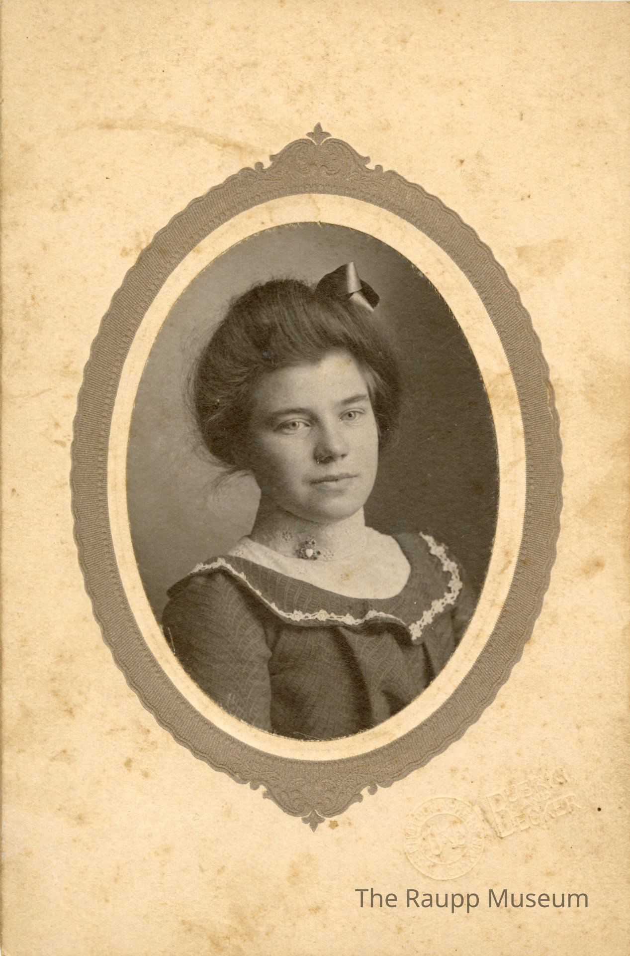 One (1) black and white portrait photograph of an unknown women from the waist up. The photo is oval, attached to a mat board, with a decorative brown border around it. The women is wearing a dark top with white lace around the neck and white lace decoration on the collar. She has on a brooch on the right side of her neck. She has her hair up and a bow in her hair on the left.