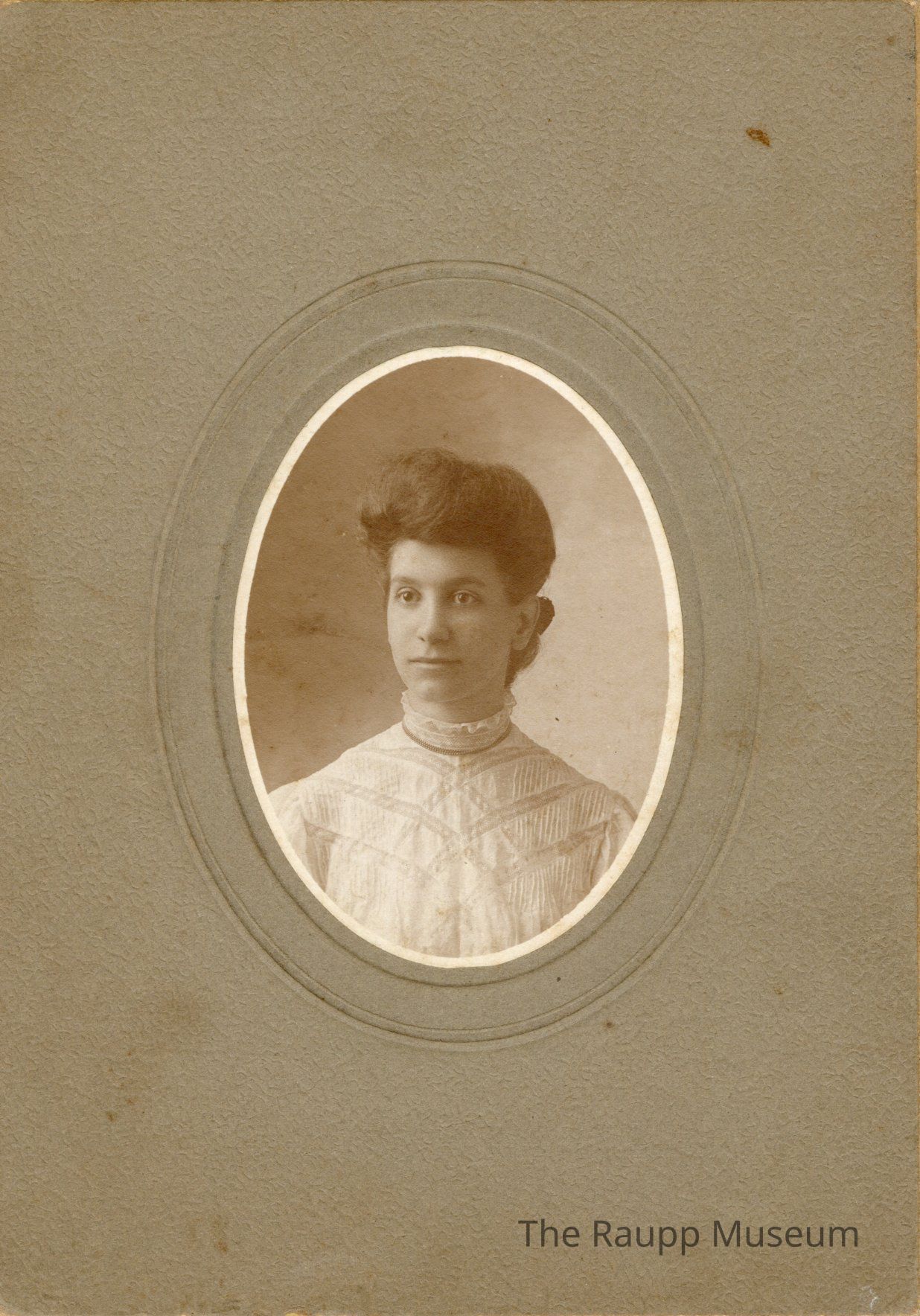 One (1) black and white sepia toned oval portrait photograph of an unknown women from the waist up. The women is wearing a white lace top with a crisscross line pattern. She has dark hair that is seated up on top of her head. The portrait is attached to a mat board with stamped border around the photo.