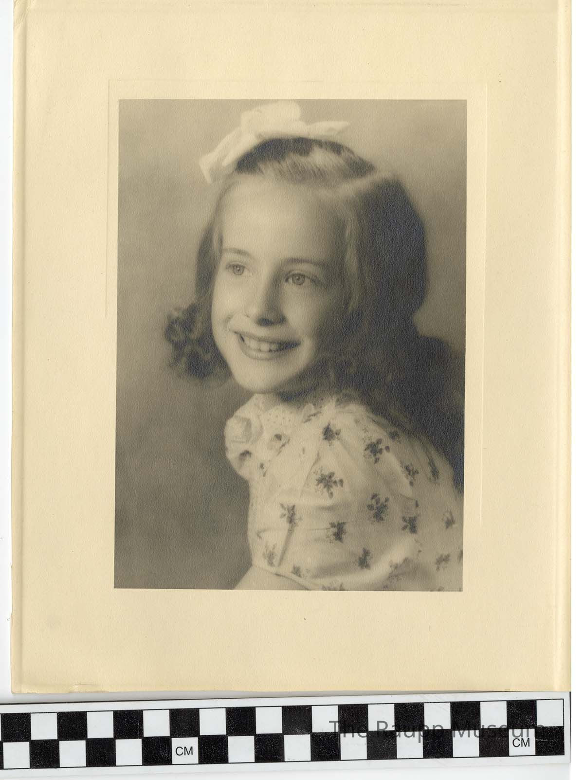 One (1) sepia toned, black and white photographic print of a young girl from the shoulders up. She is facing the camera but looking towards her right slightly. Her hair is short and curled at the bottom and parted on the left with a white bow on the right. She is wearing a floral print white shirt. Found with misc. photos box. The photo is printed onto to a yellow mat frame.Dimensions