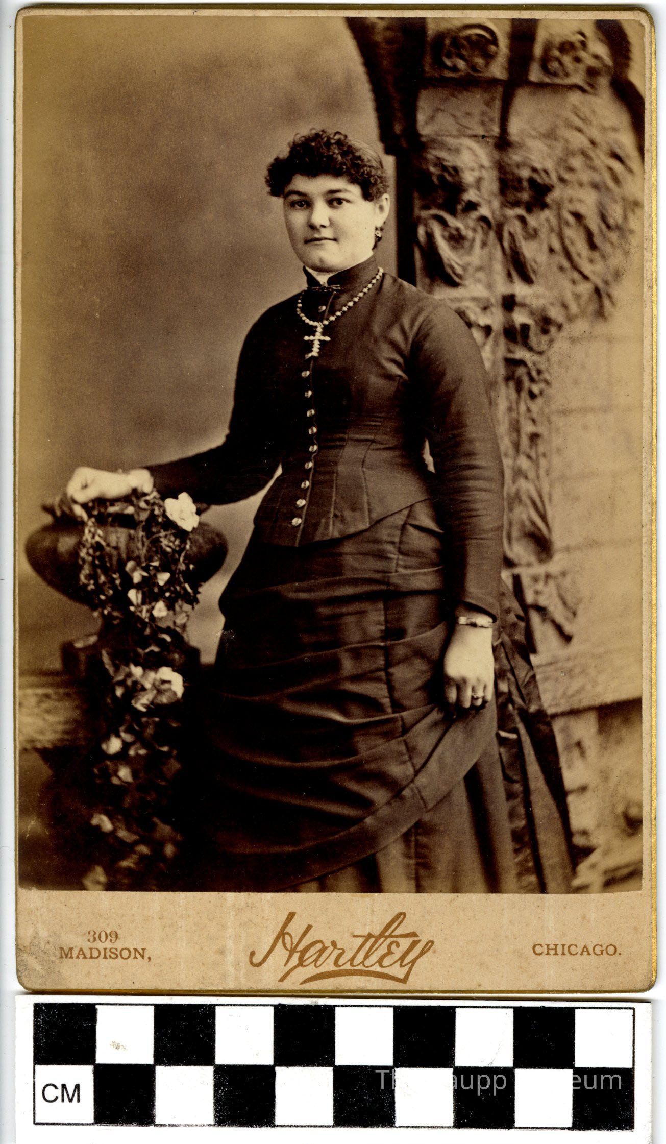 One (1) black and white sepia toned photograph of an unidentified woman. She is wearing a two piece black dress, with ruffles in the front of the skirt and a button down top. She is wearing a light colored cross necklace. Her right hand is resting on a pot with flowers and leaves draped down the side. Her left hand has a bracelet. Behind her is a decorative pillar. The photo is attached to a beige mat board with bronze printing on the bottom: "Hartley, 309 Madison, Chicago".Made/Created