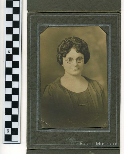 Black and white print suspended with photo corners into a gray textured paper folder with tab closure. Portrait image of a woman with short, curled hair and round glasses. She is wearing a pin-tucked shirt with a small rectangular pin in the center of her chest. Studio logo printed on the mat beneath her portrait.